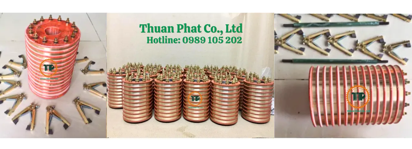 Bộ cổ góp điện 4 pha 80 x 140 mm dùng cho động cơ công suất lớn có dòng điện 100 A, có 4 vành đồng dày 1.5 mm, đường kính trong 80 mm, đường kính ngoài 140 mm, than sử dụng 4 than đồng kèm giá đỡ liền khối chắc chắn, đi kèm cây ty cố định các giá đỡ than.
